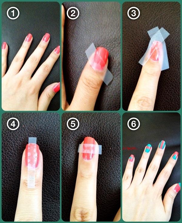 Đối vớ những bạn gái hay những bà mẹ quá bận bịu vớ công việc mà không có thời gian để ra tiệm làm móng. Để có được những hình vẽ đơn giản mà đẹp cho bộ móng của mình các bạn có thể dùng những đoạn băng dính nhỏ, định hình những đường nét muốn vẽ trên móng, bạn sẽ có một bộ móng sáng tạo độc đáo theo ý của mình mà không tốn kém tiền bạc, cũng như thời gian của bạn.