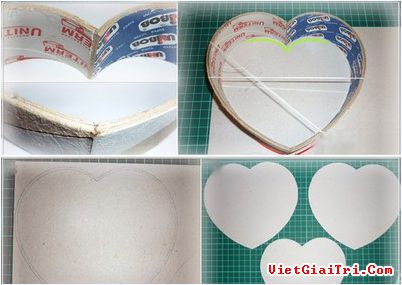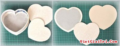 Tiếp theo bạn đạt trái tím vào miếng bìa cứng rồi vẽ để lấy hai hình trái tim lớn có cùng kích cớ với khung hộp và một trái tim nhỏ hơn trái tim lớn khoảng 1cm. Cắt giấy màu tùy thích dán kín 3 trái tim vừa cắt, bạn tiếp tục cắt dải giấy dài dán xung quanh khung trái tim mà bạn đã tạo lúc đầu