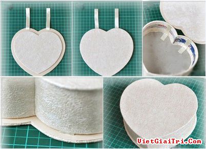 Sau khi hoàn thành bước tạo khung hộp hoàn chỉnh, bạn dùng dao dọc giấy dọc 2 khe nhỏ trên 1 tấm bìa hình trái tim lớn. rồi cắt 2 đoạn dây ruy băng luồn vào hai khe nhỏ trên hình trái tim vừa tạo để giữ cho mặt đậy của hộp khớp với khung hộp.