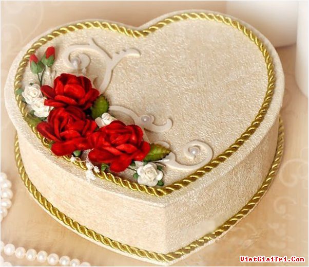 Khi đã hoàn thành xong bạn bắt tay vào bước trang trí, bạn dùng đoạn dây thừng màu vàng đã chuẩn bị, dán trang trí xung quành viền hộp theo hình trái tim. Rồi tráng trí thêm vài bông hoa hồng màu đỏ và trắng trên nắp hộp để tạo điểm nhấn xinh xắn cho hộp quà của bạn.
