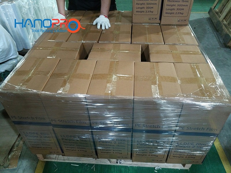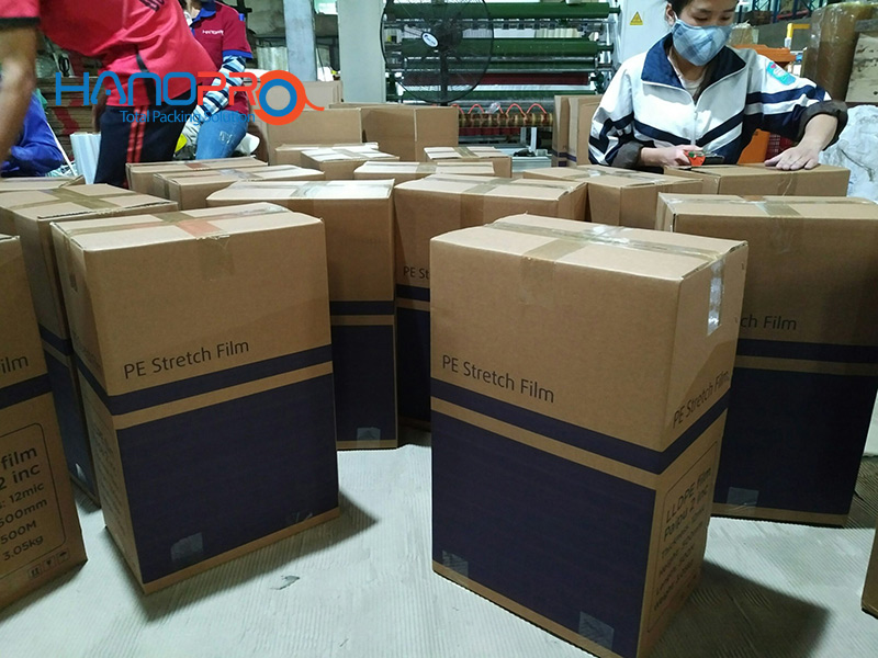 Màng pe, băng dính được đóng thùng carton đúng quy cách.